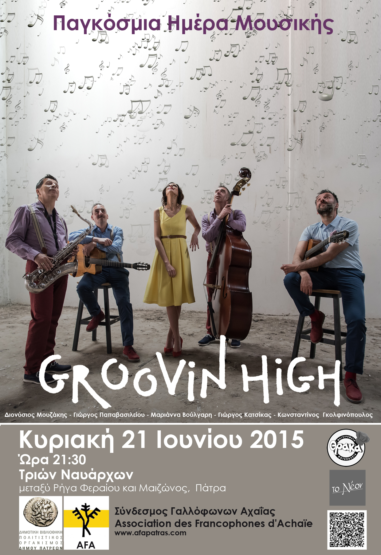 Le groupe «Groovin High» présent sur la scène du jazz depuis 2012 avec beaucoup d'apparitions en Grèce et dans des festivals jazz comme DJANGOFEST Athens en 2013, le Festival Jazz + Praxis en juin 2013, les 2 jours "Gypsy Jazz" du Festival International de Patras en Juin 2014 . Ses membres sont : Dionisis Mouzakis (saxophone), Giorgos Papavassiliou (guitare), Constantin Golfinopoulos (guitare), Giorgos Katsikas (contrebasse) et Marianna Voulgari (voix) www.facebook.com/GroovinHighBand